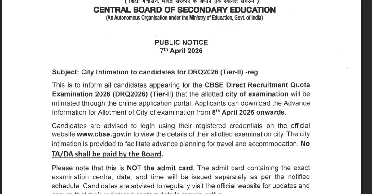 CBSE DRQ Tier 2 Exam 2026 City Slip: Ahead of the exam starting from April 18 onwards, The Central Board of Secondary Education (CBSE) will release the exam city slip on April 8, 2026. Candidates preparing to take the Tier-II examination must download the city intimation slip through the official portal. Knowing the exam centre location before the exam will allow candidates to plan their travel and manage their accommodation to avoid last-minute hassles.